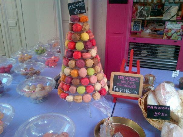 The city was more like a town. It had quaint narrow little streets lined with cafes and shops. There are apartment homes above with wooden shutters on the windows and small balconys with flowers of every color hanging down. It was the picture perfect little french town. The roads were cobblestone and brick and everything had an old world feel to it. We enjoyed holding hands and walking through the streets window shopping and people watching. We turned a corner and found a huge farmers market. They had everything you can imagine in the market. The fruits and vegetables were big and bright, beautiful colors. There was seafood and meats. There were artists selling their crafts. It seemed to go on forever and there were quite a few people here. I thought how wonderful it would be to live in one of these apartments in Toulon. To have a small place about the cafes and shops with a small balcony full of flowers and herbs. To be able to walk down to this amazing farmers market each weekend to gather fresh fruits and vegetables for cooking. The marina is just down the street with beautiful yachts and sailboats. The beach is a short bike ride away and there are many parks for kids and dogs. This is definitely a dog friendly town - we saw many yorkies which made me long for a cuddle from Ben. I sure do miss that little guy. If my life were different this would be an amazing way to live. We spent a few hours walking and taking pictures throughout the town. We stumbled upon a little brightly colored bakery. He had a display outside of macaroons of every flavor and color. Neither of us had ever had a real fresh macaroon before so we had to try them. We purchased a chocolate and a raspberry macaroon - I talked to the baker, he was very friendly and said this little shop was his dream and he is happy he had the opportunity to do this. We took our macaroons around the corner where we found a beautiful fountain where we could sit and eat. They were delicious! We wish we could've purchased more to bring home for everyone but they never would've made it. Let me just tell you the flavor was perfect not too sweet and the cookie just melted in your mouth. It was a delicious snack in the perfect location.