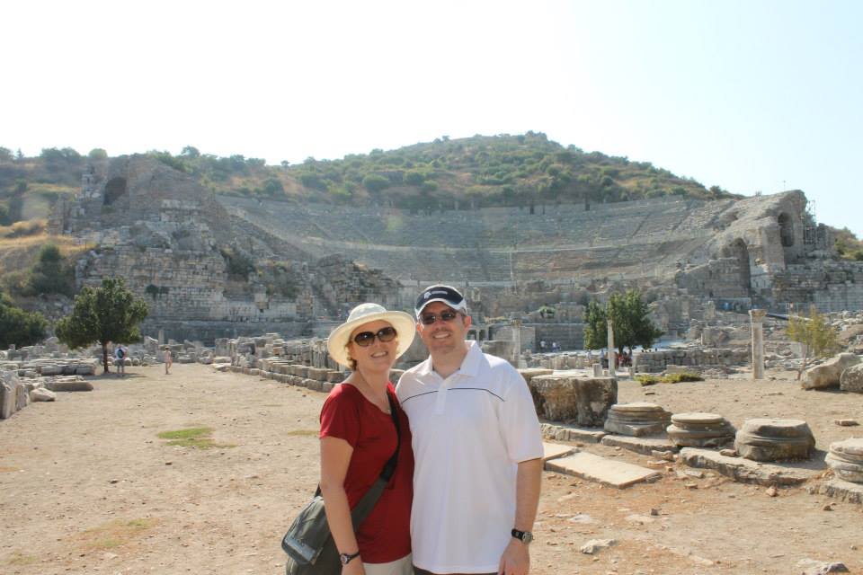 We were able to walk along the marble roads, you could see the grooves in the road made from the chariots. Some areas have been rebuilt from the archeologists findings. We saw a variety of old retail buildings and homes. We were able to walk through a Roman bath that was fairly intact, it was crazy to think that they had running water and a sewage system. Further down the road we saw a statue of Artemis and a carving of the goddess of Nike. The details in the carvings and mosaics were amazing, these would be hard to do with today's technologies and tools, I can't imagine how they created these back then. The next structure we saw was the library - I think this was one of the most impressive. It was all made of marble and had huge columns in the front that were intricately carved. This was the largest structure in the city (except for the stadium). Only the men were allowed to enter the library, the women were not to be educated, they were meant to raise the family and take care of the home. Across from the library was a brick type building that they thing was the brothel due to some of the carvings in the stones. Also they found a tunnel leading from the library to this building. The thought is that this was a way for the men to get to the brothel without their wives finding out because women were not allowed in the library. Tricky! Men were sneaky bastards even back then!