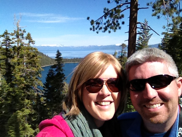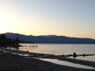 The next morning we were up early to watch the sunrise - amazing! Once the sun was up went to a great local spot called the Log Cabin for breakfast - YUM is the best description. After breakfast I called my dad. He and his wife, Marjorie, live in San Francisco which is a quick drive away so when I told him we were headed out he jumped at the chance to come spend some time with us. There were on the road and arrive a short time later. It was great to see them and get a chance to spend some time together - last time I saw them was New Years in Vegas. We all loaded into the car and took a drive around the lake. This is a fairly short trip, a couple of hours, but the changes in scenery along the way were amazing! We started at the North Shore and traveled East all the way around. You start in a small town area which leads to a trail of million dollar homes, then you travel around a bend and like magic you are transported to pine trees, snow, and beautiful views of the lake. We stopped many times along our route to take some pictures - I'll add some to the photos section of the site soon. The South Shore is totally different from the North - there were ski lodges, lifts, shopping, shopping, shopping, and casinos. Way more touristy and less relaxing than the North Shore. But, it was cool to drive through and see it all. The West side of the lake is by far more scenic. The road is a sheer drop off on the lake side and mountain on the other. We took a detour to Squaw Village. My angels had given us tickets on the tram to go to the top of the mountain. They held the Olympics here in 1960 so there was a ton of Olympic memoribelia around the area. It was cold but not crazy cold, a jacket and a scarf did the trick. We enjoyed lunch here before heading back down. We were all pretty tired by then so we took time to rest (aka nap). We met up later for drinks and dinner - another great spot right on the lake called Garwoods - it's huge and apparently always full. Dinner was good and the company was even better! This was our last night at the lake - it had gotten a little colder and windy so no sitting on the patio tonight.